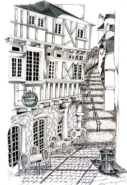 Encre monochrome représentant la ruue Saint René à Auray, port de saint Goustan.